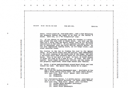 Bachir était déjà de la partie, il est le maître d’oeuvre (avec Nicolas Couturier) du catalogue en ligne, où on trouve notamment des notes introductives qui convoquent les voix de Robert Smithson, Trevor Paglen, Ursula Biemann, Irit Rogoff, Stuart Hall and more. On y trouve aussi le fax envoyé à Tacita Dean par l’Utah Arts Council, avec les indications pour rejoindre la Spiral Jetty de Robert Smithson sur le Great Salt Lake . Tacita Dean n’y parvint jamais, cf sa pièce sonore « Trying to Find the Spiral Jetty » (1997), que nous nous proposons de rejouer le 27 août 2015… Stay tuned.