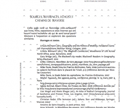 « Territoire à la fois infini et clos sur lui-même (double illusion), « le désert » cristallise un vaste faisceau de références et de disciplines, de la géographie à la littérature, de la philosophie à la biologie, de la cartographie à l’écologie. La blancheur sans qualités – ou fantasmée comme telle – du désert (qui ne peut souvent être embrassée que grâce aux cartes ou à des représentations aplanies) en fait un espace idéal de projection, d’inscription et de planification pour fantasmes politiques, utopies architecturales, expéditions scientifiques et récits de fiction plus ou moins fondateurs. Il est l’image de ce lieu hors du temps et du monde, une hétérotopie dont les représentations sont souvent connotées de romantisme. Il est aussi un paysage, un révélateur, un théâtre, un laboratoire, où se croisent trajectoires migratoires, expérimentations sociopolitiques et tentatives d’hégémonies nationales : un lieu avant tout traversé et constitué par des corps et des histoires. »