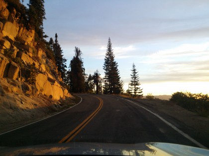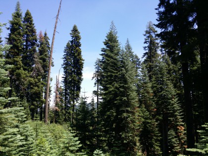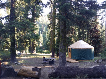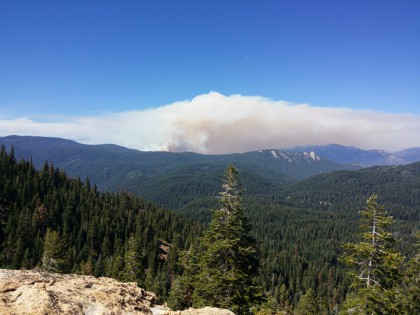 Hormis ces petits désagréments, le Quaking Aspen Camp est un lieu paradisiaque (Jim Harrison style): notre yourte (ouiiiii) est nichée sous les séquoias, les pins ponderosa et les cèdres, à mille miles de toute terre habitée, et à bonne distance des (rares) autres campeurs. Les écureuils sont nos amis, les zoizillons aussi, et nous recevrons même la visite d’une biche aux grandes oreilles frémissantes et de ses deux faons. On fait l’expérience de la SOLITUDE sur le Summit Trail, sentier de randonnée qui monte au milieu d’arbres immenses, de paysages immenses (« euh, t’as entendu ce craquement? Tu crois que c’est un ours? »), sans autres humains que nous, minuscules nous, pendant des heures de marche. Bachir dit qu’à une telle altitude, dans les Alpes, il n’y aurait déjà presque plus de végétation. Arrivés en haut d’une crête, on voit, à deux vallées de là, la fumée rougeoyante du feu de forêt, à perte de vue.