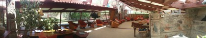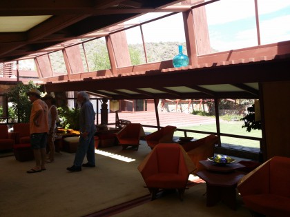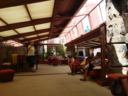 Wright professe l’inscription de ses bâtiments dans le paysage et l’usage de matériaux locaux. La visite de Taliesin West, guidée par Myrna et son ombrelle en forme de fleur bleue (il fait près de 45 degrés) permet de feuilleter dans l’espace les étapes successives de la conception de ce lieu extraordinaire, et la manière dont chaque élément s’inscrit dans un projet d’apprentissage, guidé par les principes architecturaux de Wright (ou ses lubies: ne supportant pas la vue des nouveaux poteaux électriques que la ville de Phoenix avait eu le toupet d’installer sur la route en contrebas, il changea l’orientation de toutes les pièces de vie).
