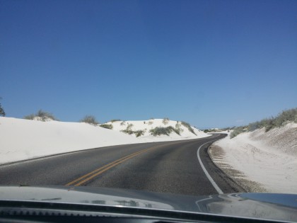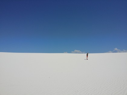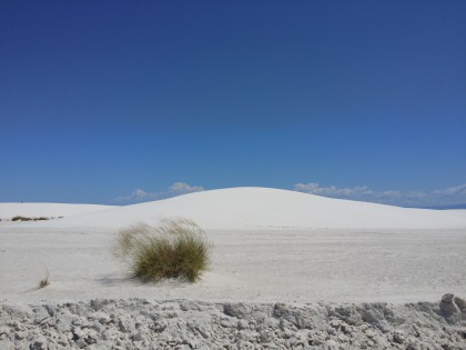 Une demi-heure et 30 degrés Farenheit plus tard (19 degrés Celsius > 35 degrés Celsius), nous voici aux portes sablonneuses de White Sands, désert de dunes immaculées, faites de gypse qui scintille aveuglément sous le soleil de midi. Un phénomène géologique rare, sur lequel je vous invite à vous renseigner en ligne (ou pas). Parmi les rares organismes qui s’accrochent à cette beauté inhospitalière, le yucca, plante admirable, et la table de pique-nique en métal, à l’ombre de laquelle nous ne nous hasarderons point.