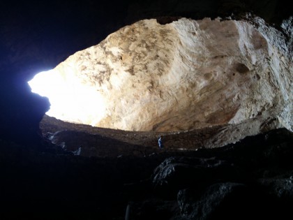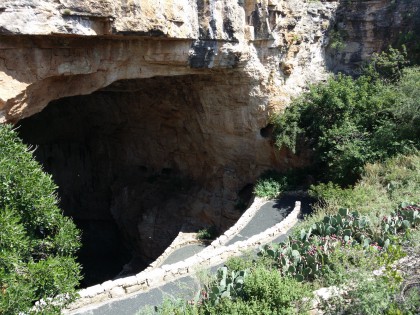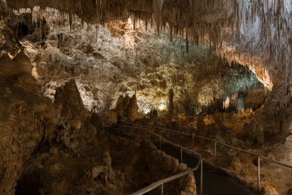 Autre ressource souterraine, le guano, ou c*c* de chauve souris. C’est en recueillant ce fertilisant naturel pour le vendre que des agriculteurs du Nouveau Mexique découvrirent l’entrée des cavernes de Carlsbad, où nichent encore aujourd’hui des milliers de chauve-souris. On peut apparemment observer leur envol spectaculaire au crépuscule, mais nous n’aurons pas cette chance. La descente à pied vers les tréfonds de la caverne, par l’entrée qui s’engouffre presque à la verticale dans les entrailles humides et fraiches de la terre, est impressionnante. On s’enfonce dans un dédale sculpté de dômes, de draperies, de lacs ingénieusement éclairés pour faire ressortir les teintes de la roche (parfois presque chair, Alien-style) tout en rappelant que sans les câbles qui courent discrètement le long des parois, nous serions dans le noir le plus complet. Les panneaux explicatifs nous invitent à reconnaître des formations géologiques baptisées « popcorn » ou encore « pailles de soda » par des scientifiques gourmets (ou soucieux de pédagogie). Au bout d’un mile de descente, nous progressons bouche bée dans la caverne proprement dite, intimidés par la révélation de ces mondes souterrains construits au gré d’effondrements massifs et de goutte-à-gouttes millénaires.