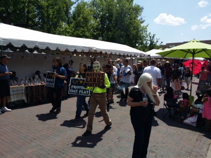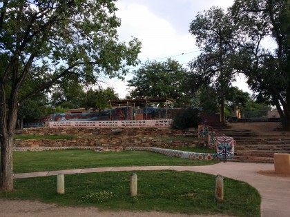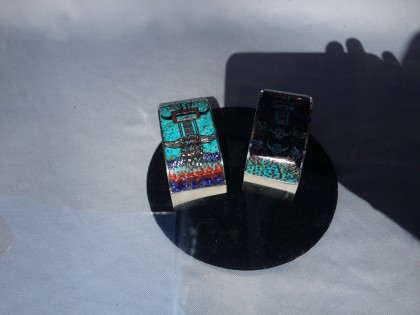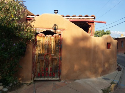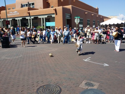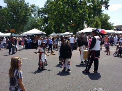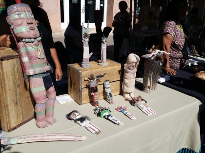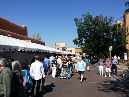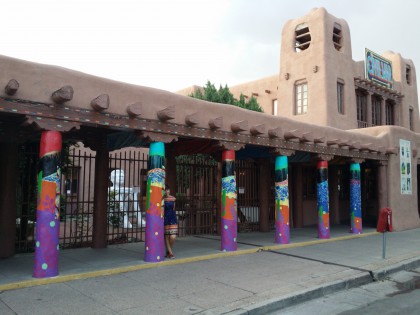 Des maisons en adobe colorée, des portails en bois sculpté et métal ouvragé, des brassées de laurier rose, des guirlandes de piment rouge, des cyclistes, des trottoirs avec des piétons… C’est un enchantement de traverser Santa Fe après de longues heures d’autoroute bordée de maisons préfabriquées en plastique et de quelques stations service délabrées. Par chance, nous arrivons la veille du Santa Fe Indian Market, organisé par la Southwesten Association for Indian Arts, grand rendez-vous annuel des artisans et des artistes Navajo, Hopi, Pueblos, Zunis, et autres peuples du sud-ouest des Etats-Unis actuels. Chaque dernier week-end d’août, ils/elles viennent vendre leurs créations à des collectionneurs acharnés, qui se pavanent dans les rues couverts de leurs plus belles acquisitions des années passées (soixantenaires bronzés en combo santiags, blue jeans, gros ceinturon d’argent ouvragé, bagues de turquoise, chemise ouverte et colliers de pierres semi-précieuses, Stetson et Ray-ban, si-si; les femmes arborent robes de perles, châles plus ou moins « ethniques », et énoooormes bijoux) mais aussi à des amateurs (comme nous! ouiiiii) et à des musées. Argent et turquoise dominent, fruit d’échanges anciens entre orfèvres Navajo et joailliers Hopi. Certaines pièces sont d’une beauté impressionnante, comme les bracelets de Carl et Irene Clark, composés de milliers de minuscules pierres taillées, assemblées au cours de plusieurs mois de travail pour représenter des divinités (ou esprits) Navajo.