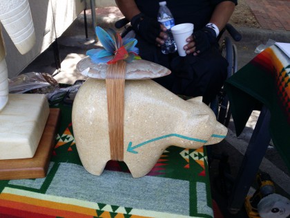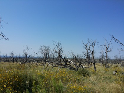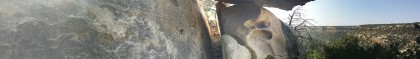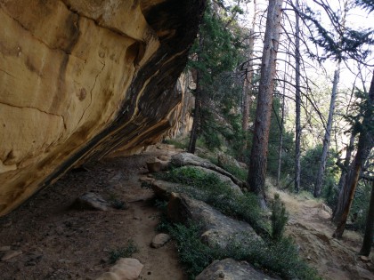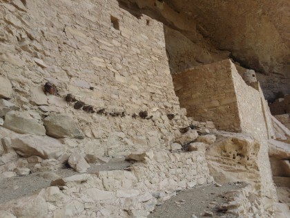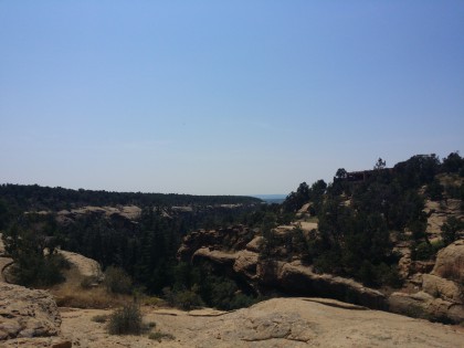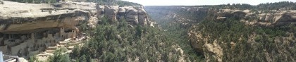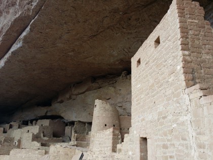 Après une douce nuit au Country West Motel de Mancos, à peine troublée par les tribulations d’une araignée intrépide, avec ses vilaines pattes tricoteuses, sur mon visage d’arachnophobe endormie (mais bientôt réveillée), nous nous élevons à pleines roues vers le plateau de Mesa Verde, autre site Pueblo fabuleux, au bout d’une route bordées d’arbres dessèchés, tout enroulés sur eux-mêmes suite à un incendie. Près de 300 habitations ou ensembles d’habitations y ont été construits aux 12ème et 13eme siècles dans des « alcôves » sous le rebord des falaises. Nous commençons par Spruce Tree House, où l’on peut descendre dans une petite kiva, et d’où part le « Petroglyph Trail », une randonnée splendide à fleur de roches sculptées, mouvantes, de passages étroits taillés dans des dégradés de blanc-jaune qui sont des paysages à eux tout seuls. Nous devrons malheureusement finir le parcours (deux heures en tout) en courant sous le soleil implacable de midi pour arriver à temps à la visite guidée de Cliff Palace, après avoir déjoué hardiment le piège tendu par un serpent sournois (comme il se doit).