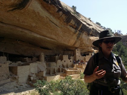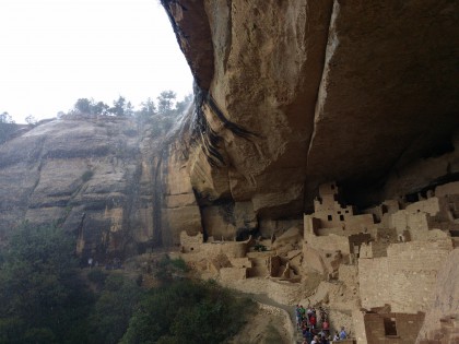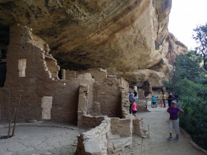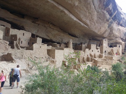 Ranger Sally, petite souris verte engoncée dans son pantalon trop grand, nous présente avec verve les merveilles architecturales de Cliff Palace, site qui aurait abrité plusieurs centaines d’habitants sous le rebord ventru d’une falaise impressionante. On y accède par des échelles et des escaliers taillés dans la roche. La plupart des questions restent en fait sans réponse, car tous ces sites ont été désertés brutalement au 13e siècle, provoquant la migration des « Ancestral Pueblos » vers l’Arizona et le Nouveau Mexique, où certains de leurs descendants vivent encore aujourd’hui. Alors que la visite se termine, un orage torrentiel éclate. La pluie dégringole en rideau depuis le plateau qui surplombe Cliff Palace, dont les anciens occupants auraient alors sans doute sortis des récipients pour collecter l’eau. Des éclairs zèbrent le canyon devant nous, le talkie walkie de Ranger Sally annonce qu’un éclair à frappé le site voisin de Balcony House, un incendie est déclaré! C’est un petit incendie, heureusement, comme il y en a des dizaines chaque été, nous rassure Ranger S. Devant la falaise brouillée de pluie, nous nous sentons suspendus dans un temps sans écriture et sans citernes, où de tels orages sont des puissances à la fois menaçantes et vitales. Heureusement, nous avons nos réserves de mandarines séchées.